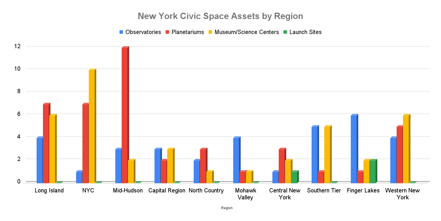 New York has more than 100 planetariums, observatories, museums, and schools involved in space exploration and astronomy that make up its civic space sector. These institutions are key members of their communities, providing unique and invaluable resources to residents of all ages. They also serve as hubs for research, development, and education, which in turn generates economic activity and creates jobs.