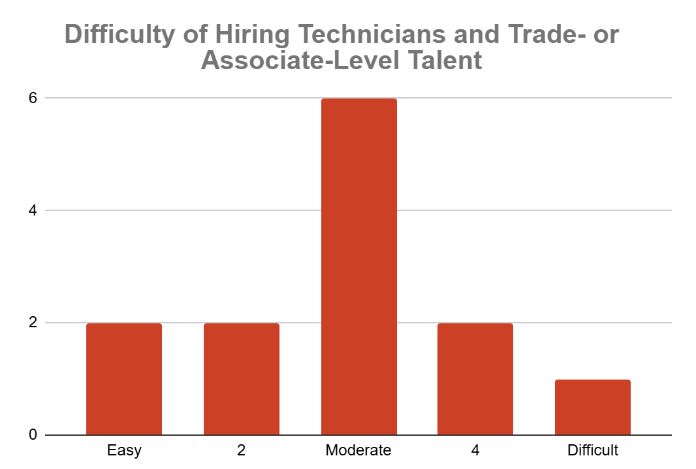 Most companies report at least Modest difficulty with acquiring Technicians and Trade/Associates-level talent. This indicates a need to build out this level of technical-based programming from the academic sector.