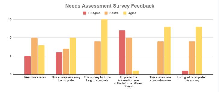 Respondents were generally satisfied that they completed the survey, found it comprehensive, and agreed it took too long to complete. This indicates a need for greater concision in some lines of questioning to make the survey more efficient and reduce completion times.