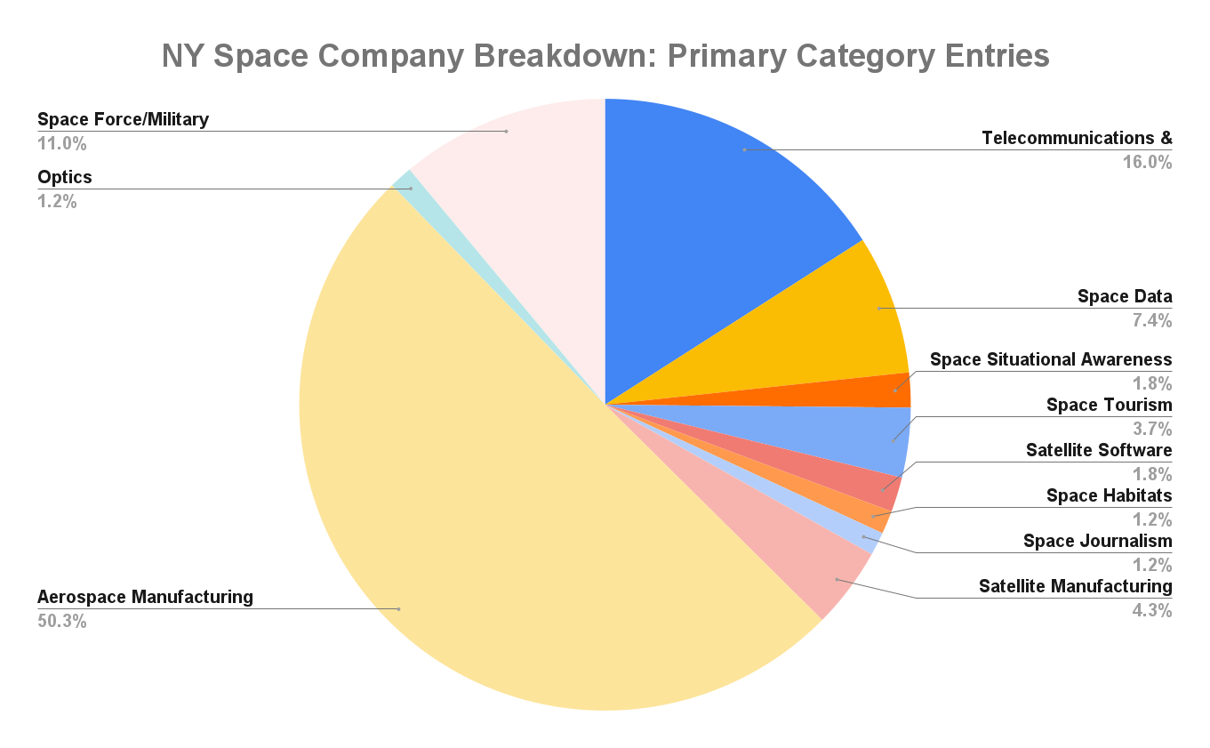 New York is home to a vibrant and diverse space economy with a wide variety of companies active across the state. Every region is home to at least a slice of this activity, with some regions possessing highly specialized and diversified space sectors. The primary sub-sectors in the state are aerospace, telecommunications, space data, and space force/military related enterprises.